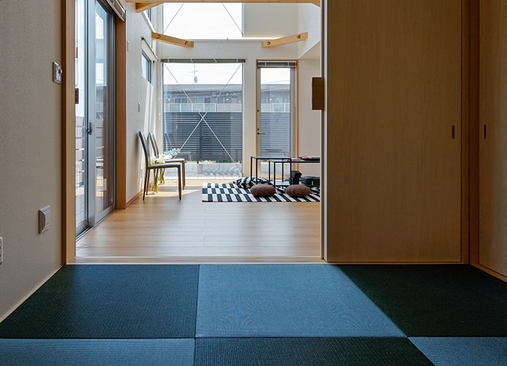 縁(へり)のない正方形の畳は、モダンでスタイリッシュな印象を与えます。お好きな色を組み合わせて、お部屋に合わせた畳をお作りすることができます。